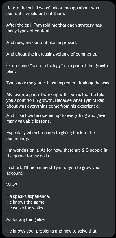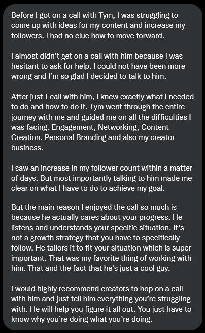 Most methods fail to get you results because:They only work when the perfect conditions exist.Let me explain:The top creators say you need to write threads and optimize your profile to grow.But that only works if you already have an audience that you can leverage!And that's why it works for them, but not for you.That's just the surface level though...Remember:Most growth strategies only work under the perfect conditions, they don't work for someone at your stage of the journey.Screw that.There's a much better way.You'll be glad to know that...Today you have the opportunity to access my Twitter growth coaching program.